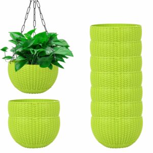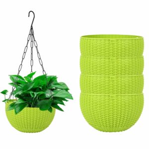ORILEY 8.6 Inch Round Rattan Hanging Pot with Hook Chain Decorative Pots Holder for Home Balcony Garden Lawn Patio Park (Pack of 5, Green)