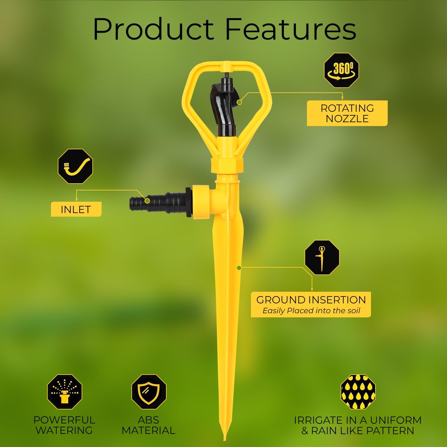 • FULL COVERAGE: The sprinkler can rotate a full 360 degrees, ensuring complete coverage of the lawn or garden without missing any spots.
