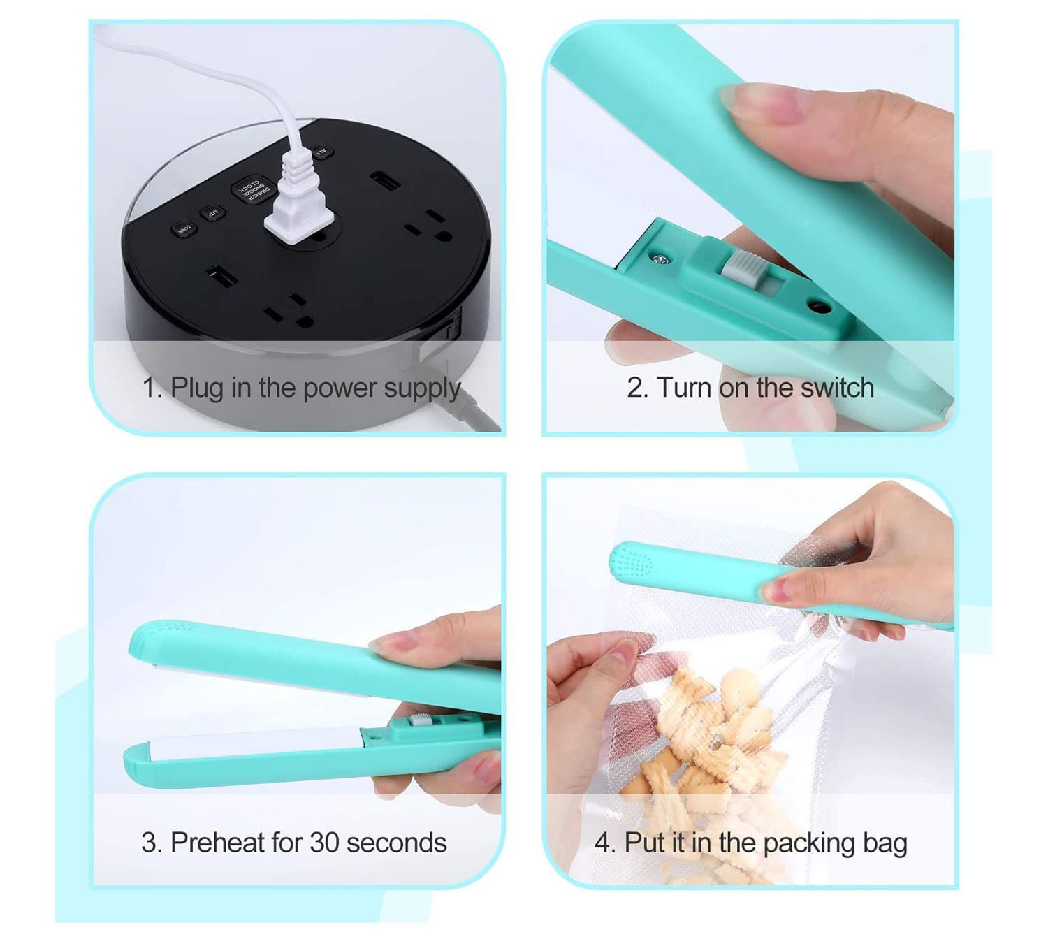 • HOW TO USE: Place the bag in the middle of the heating chip, press the heat sealer, then loosen, and take out the sealed bag. Depending on the material and thickness of the plastic bag, the sealing time will vary.